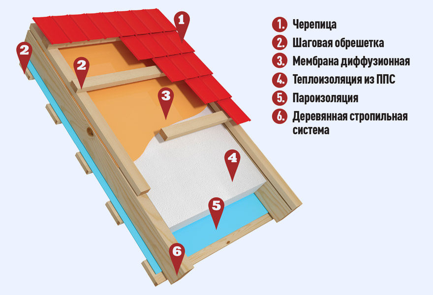 Разработан шаблон спецификации в соответствии с ГОСТ Р 21.1101-2013. Крыша мансардная, состоящая из утеплителя из пенополистирольных плит ППС14-Р, диффузионной мембраны и слоя пароизоляции. Пароизоляционная пленка монтируется со стороны помещения. Применяется в малоэтажном строительстве.