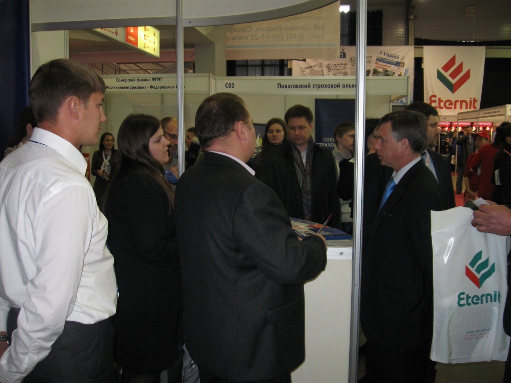 На открытие выставки стенд завода «Мягкая кровля» осмотрел министр строительства Самарской области П. К. Донской.