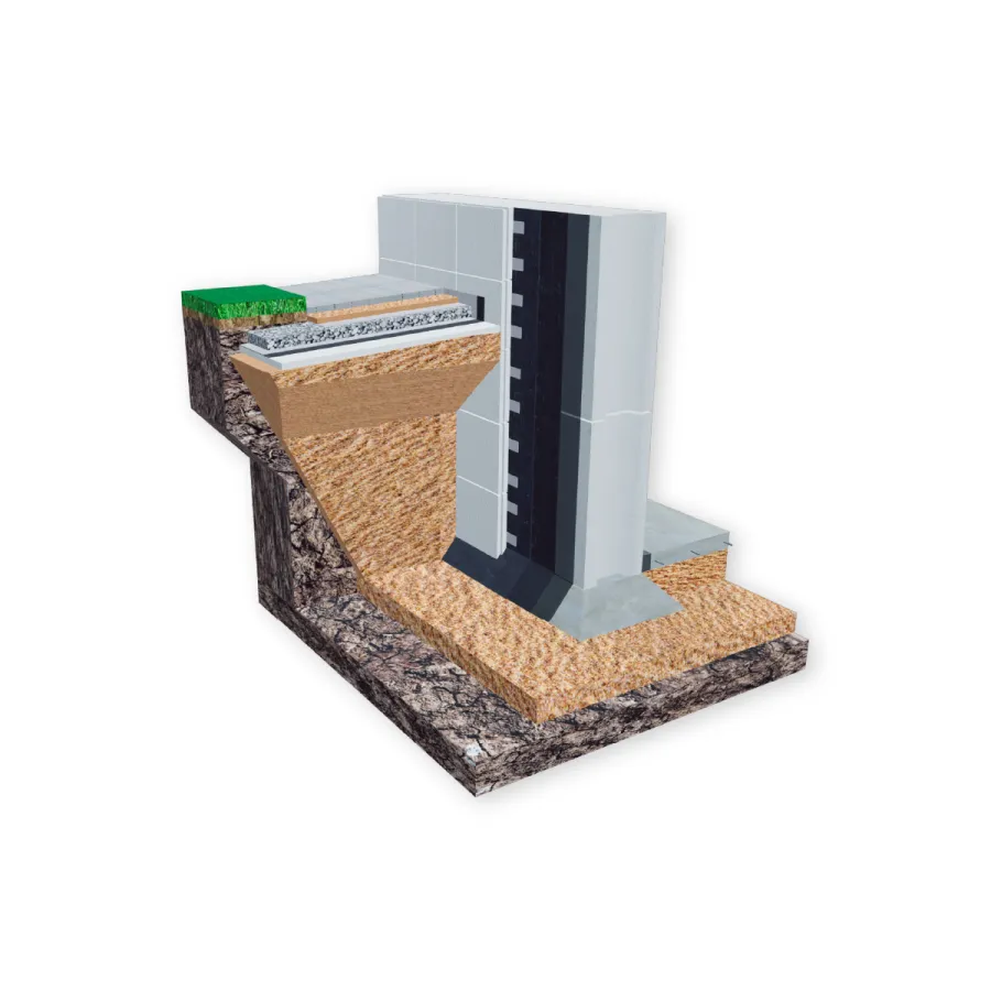 Система гидроизоляции подземных сооружений с использованием двухслойной битумно-полимерной мембраны и утеплением.